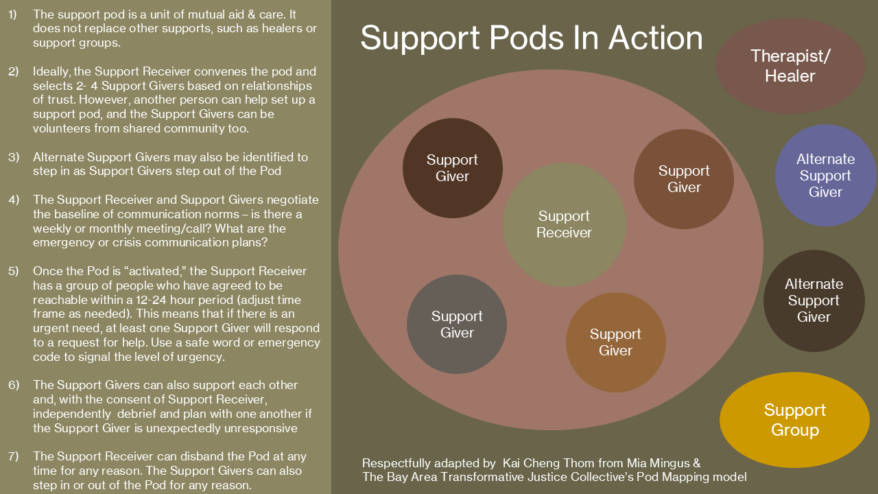 Mia Mingus & The SOIL Project: As stated above, Mia Mingus is the innovator of the “Pod/Pod Mapping” model now widely integrated into Transformative Justice worldwide. The SOIL project provides many more details on the concept of “pods” and many different ways that pods can be used - https://www.soiltjp.org/